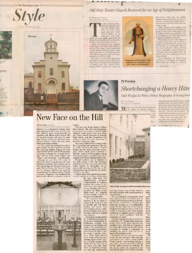...Particularly notable among the commissioned works are the bronze candleholders by Washington sculptor John Dreyfuss, at once elegant and weighty. Two wonderful polychrome sculptures by Belgian artist Pazzi De Peuter give the room a psychic crackle – a Christ figure floating on the white north wall and a standing figure of Saint Ignatius of Loyola, founder of the Jesuit order, in a high niche in the tower. The Saint looks down at departing worshippers with big, reprimanding, and reminds them of their duties in the world out there with a gentle gesture of his right hand.